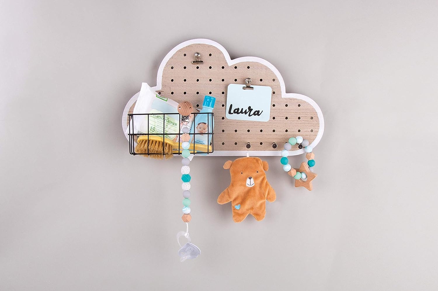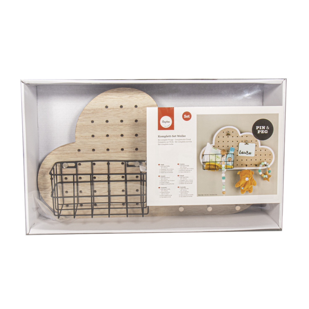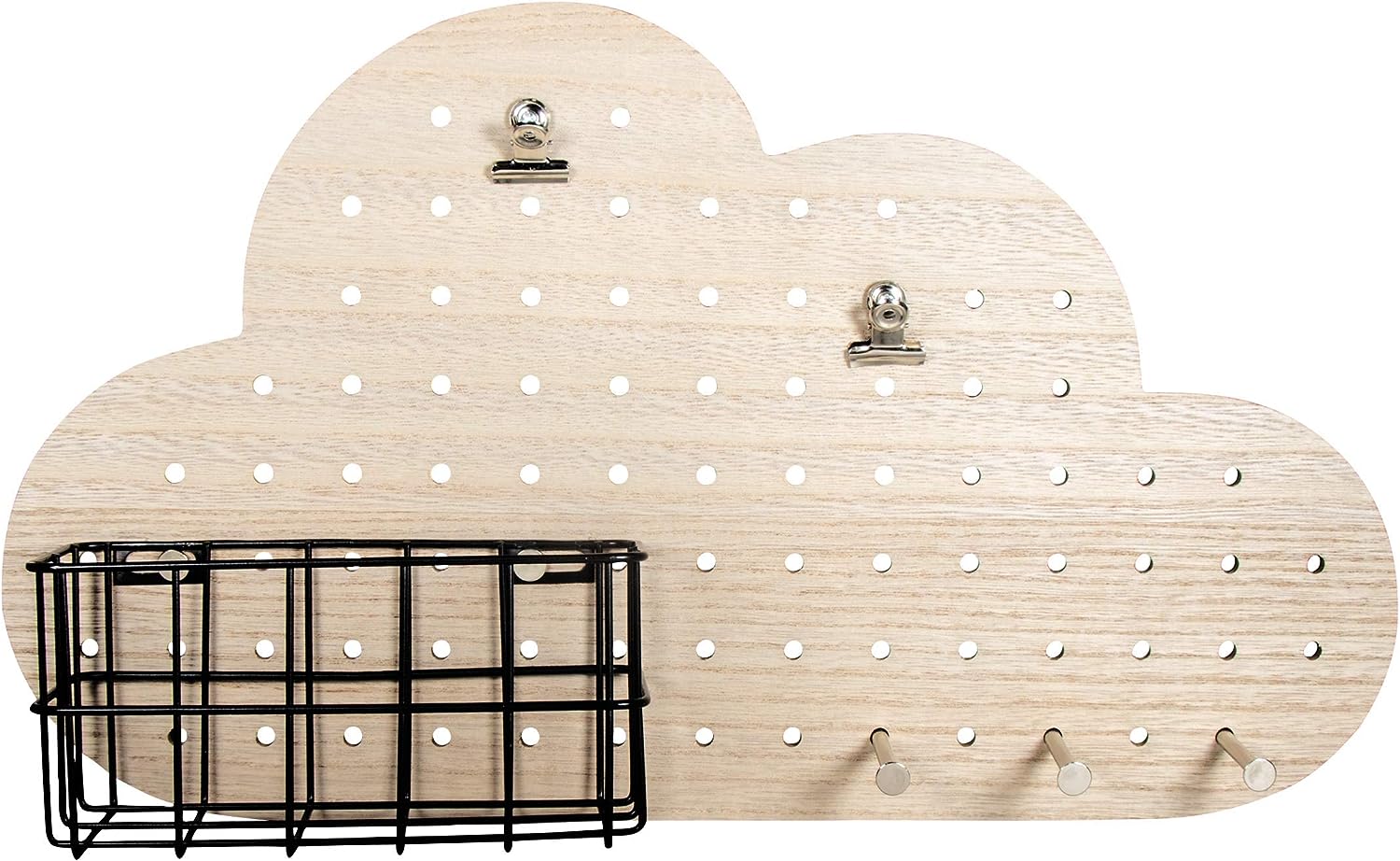Incluye: 1 tablero MDF de nube con perforaciones de 0,5 cm ø (40 cm largo y 23,5 cm alto), 1 cesta de metal negra (16,5 x 8 x 8 cm), 3 pasadores y 2 clips de metal para colocar tus accesorios